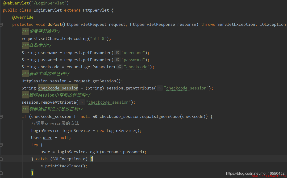如下圖所示,為了保證servlet層能夠正確接收到界面所展示的驗(yàn)證碼信息,同時(shí)因?yàn)閟ession對(duì)象是項(xiàng)目自生成的,所以我直接獲取session對(duì)象并以類似于鍵值對(duì)的形式將頁(yè)面驗(yàn)證碼信息存入session中。