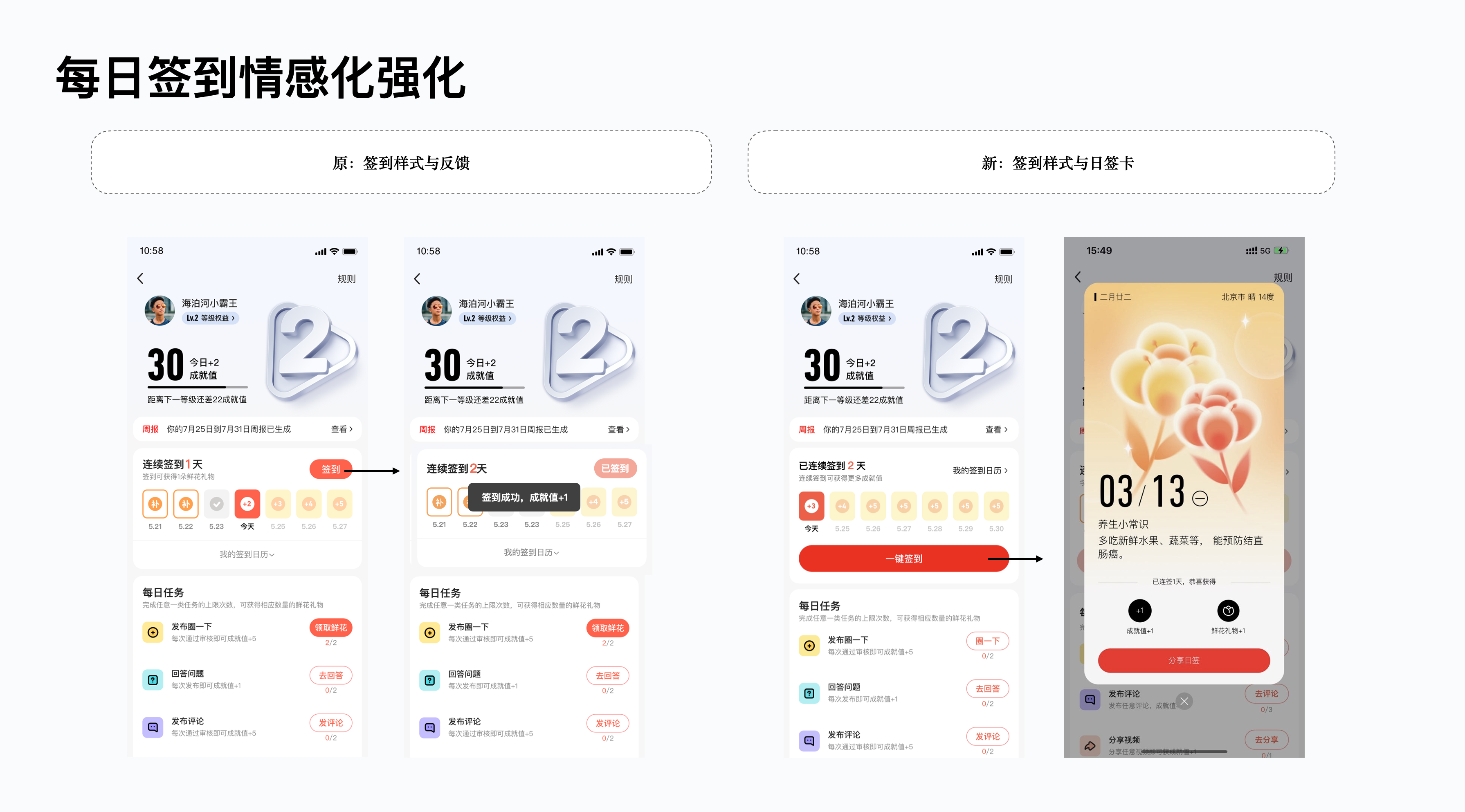 等級(jí)中的簽到是最易完成任務(wù)類型,部分老用戶始終堅(jiān)持簽到,甚至達(dá)到百日以上,表明簽到系統(tǒng)確實(shí)能促進(jìn)用戶留存。因此設(shè)計(jì)上強(qiáng)化了簽到按鈕與簽到后的反饋,并衍生出了新的簽到反饋——日簽卡。日簽卡以彌散清新的風(fēng)格進(jìn)行對(duì)應(yīng)設(shè)計(jì),配合常用的花卉、食材等圖案、文案分別對(duì)應(yīng)中年人愛(ài)看的人生感悟、養(yǎng)生常識(shí)、歷史上的今天,溫馨感十足,上線后還吸引了大量用戶分享保存日簽卡,極大的提升了簽到用戶的次日留存。