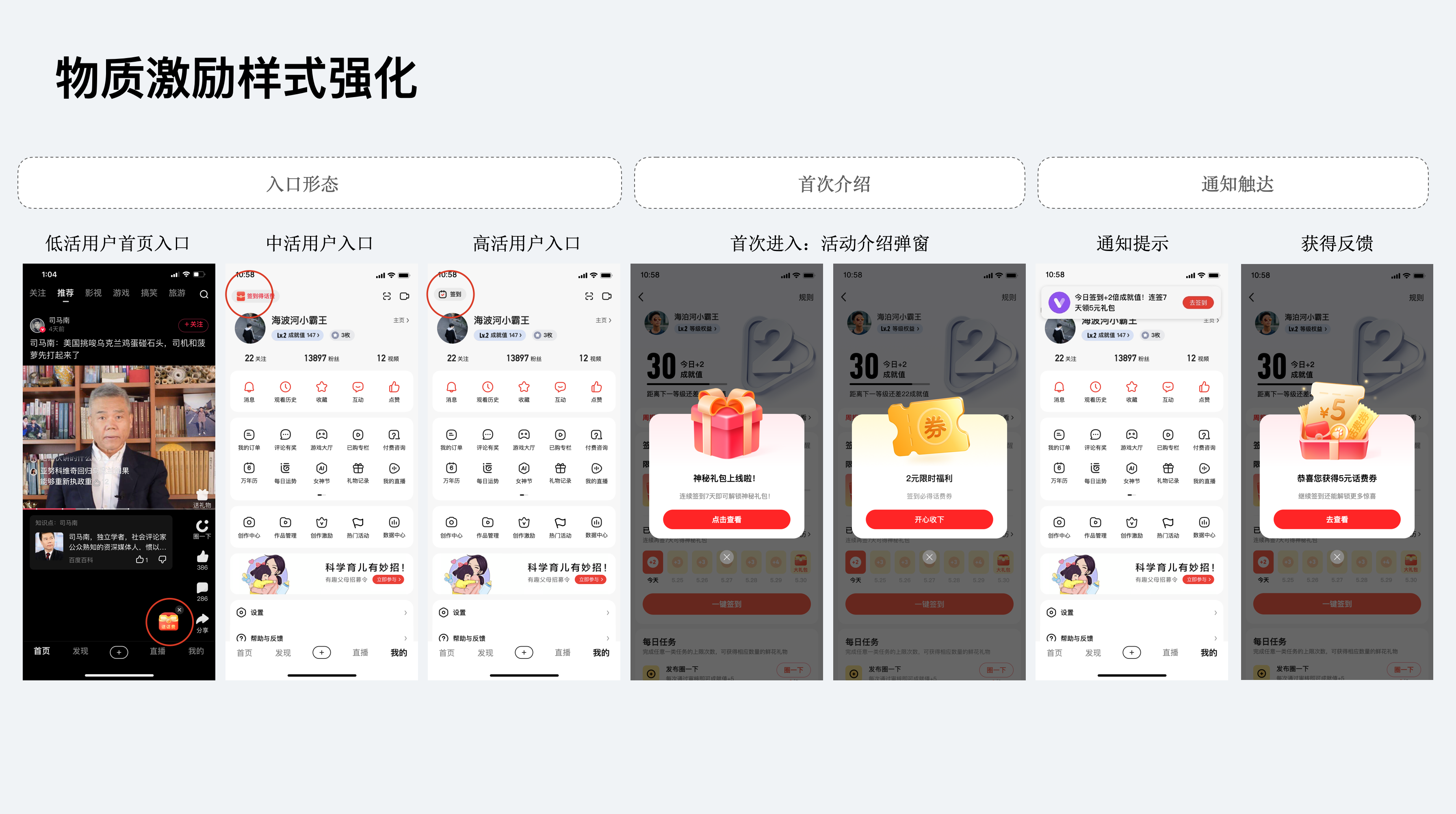 ?入口樣式:低活用戶使用了首頁(yè)懸浮球強(qiáng)引導(dǎo)進(jìn)入,同時(shí)中低活躍度的簽到入口也增加了紅包的樣式,吸用用戶快速點(diǎn)擊進(jìn)入簽到。