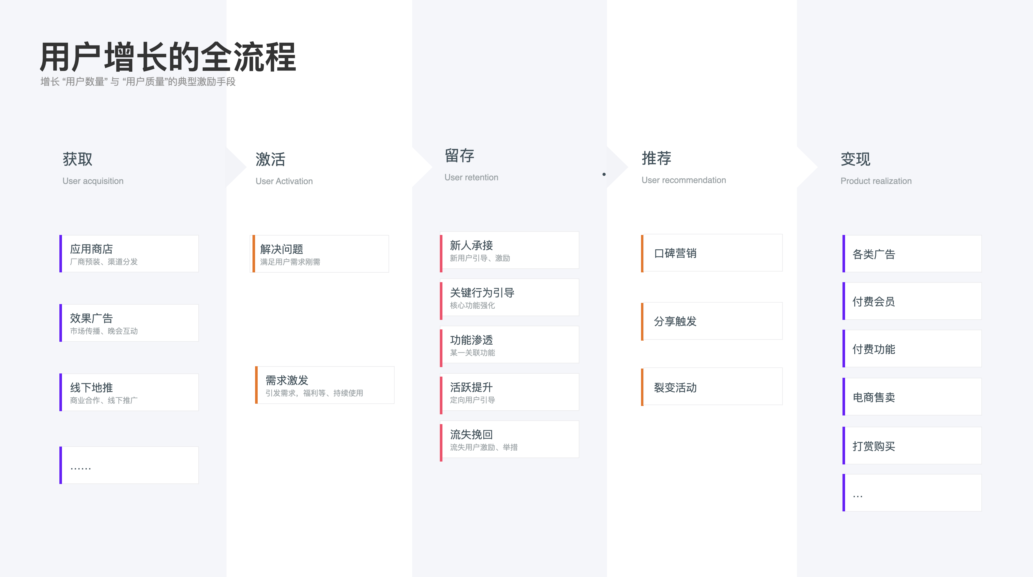 以上是用戶視角下的激勵(lì)體系,下面講講產(chǎn)品業(yè)務(wù)下的激勵(lì)體系的作用,通常情況下激勵(lì)體系伴隨著用戶增長(zhǎng)的全流程“獲取—激活—留存—推薦—變現(xiàn)”各個(gè)過(guò)程。用戶增長(zhǎng)代表著增長(zhǎng)“用戶數(shù)量”與“用戶質(zhì)量”,以上三類激勵(lì)方式都會(huì)在產(chǎn)品增長(zhǎng)的各流程中承擔(dān)著不同程度的促進(jìn)作用: