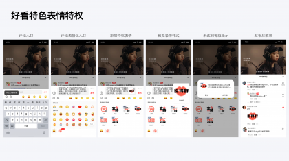 特權(quán)表情方面:我們通過(guò)評(píng)估5w條好看視頻評(píng)論數(shù)據(jù),選出高頻關(guān)鍵詞10條,同時(shí)投放到社群用戶中進(jìn)行投票選舉,宣出我們用戶最更偏愛(ài)的交流詞匯,最終選出6個(gè)表情包文案:支持、點(diǎn)贊、厲害了、說(shuō)得好、學(xué)到了、好人一生平安。隨后開(kāi)始根據(jù)這五條內(nèi)容進(jìn)行表情圖案創(chuàng)作,打造具有好看特色、正向有梗的視覺(jué)系統(tǒng)。好看用戶下沉且年齡較大,對(duì)醒目直白、突出重點(diǎn)、易讀易懂的設(shè)計(jì)更偏愛(ài)。因此圍繞文字繪制了一套簡(jiǎn)單明確又具備詼諧感的表情包圖案,在用戶傳播上也能更易傳播,更能能打造好看品牌的互動(dòng)記憶點(diǎn)。
