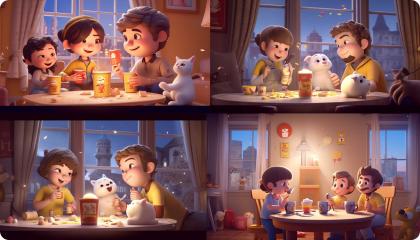 得到這張圖后,覺得畫面左上角部分有些空白,為了襯托歡快聚會的氛圍,我們決定在左上方加上掛旗。方法也是運用Midjourney的混音模式。在關鍵詞中加入“屋子里掛著彩旗”。