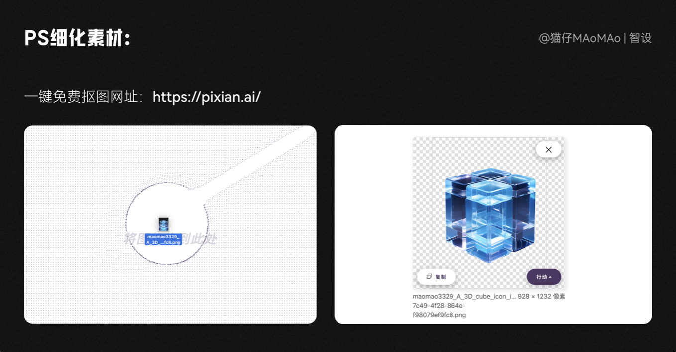 3D主視覺的部分,我們需要先進(jìn)行摳圖,如果不想使用 PS 手動(dòng)摳圖,這里推薦我常用的一鍵免費(fèi)摳圖網(wǎng)站:https://pixian.ai/ ,處理簡(jiǎn)單的圖片,直接把圖片扔進(jìn)去就好了,簡(jiǎn)單好用~
