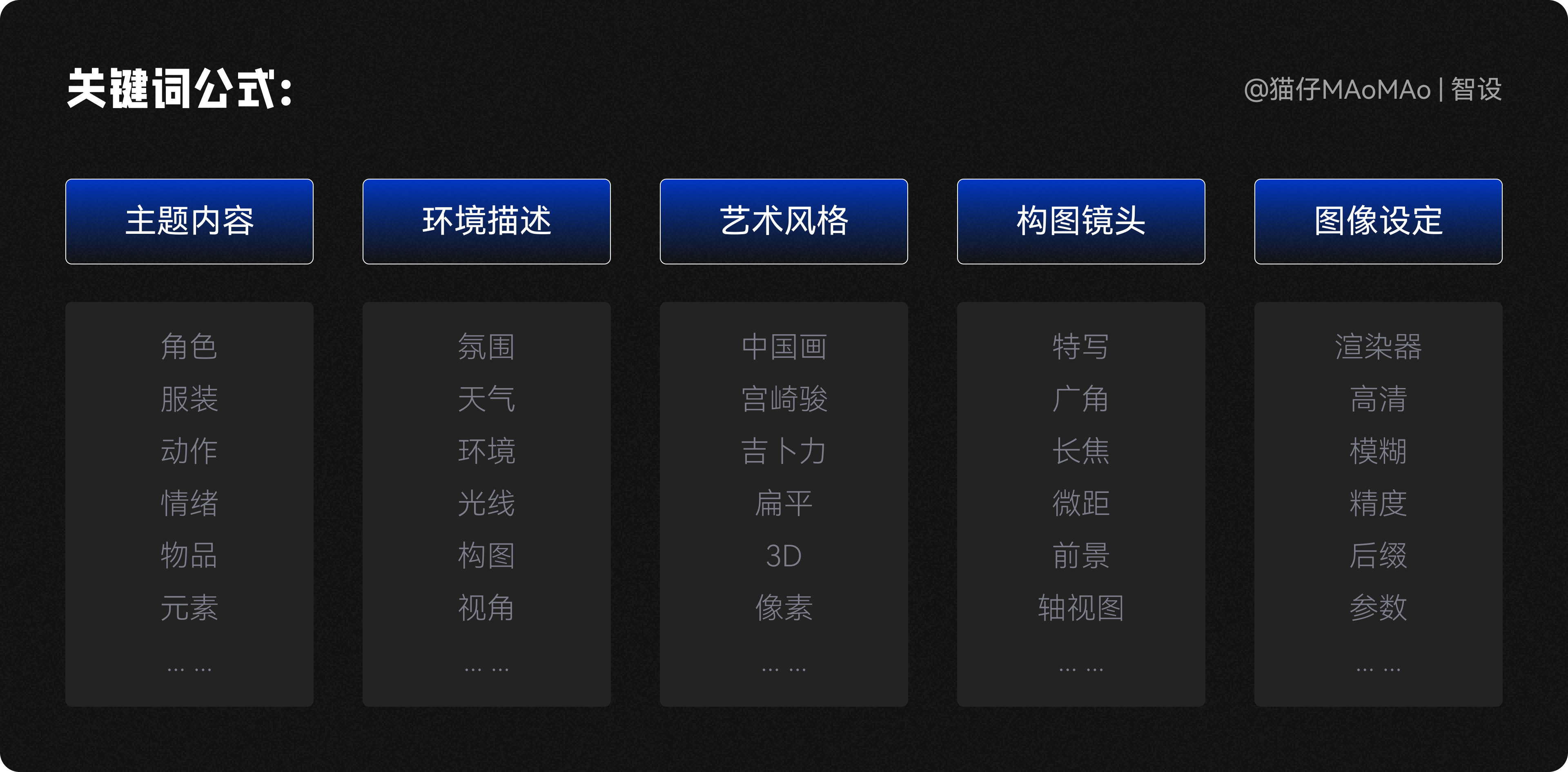 3D主視覺我們采用文生圖的方式制作,寫關(guān)鍵詞的基本公式參考下圖,具體寫關(guān)鍵詞時(shí),需要靈活進(jìn)行增減,然后不斷嘗試,直到出現(xiàn)自己滿意的效果。