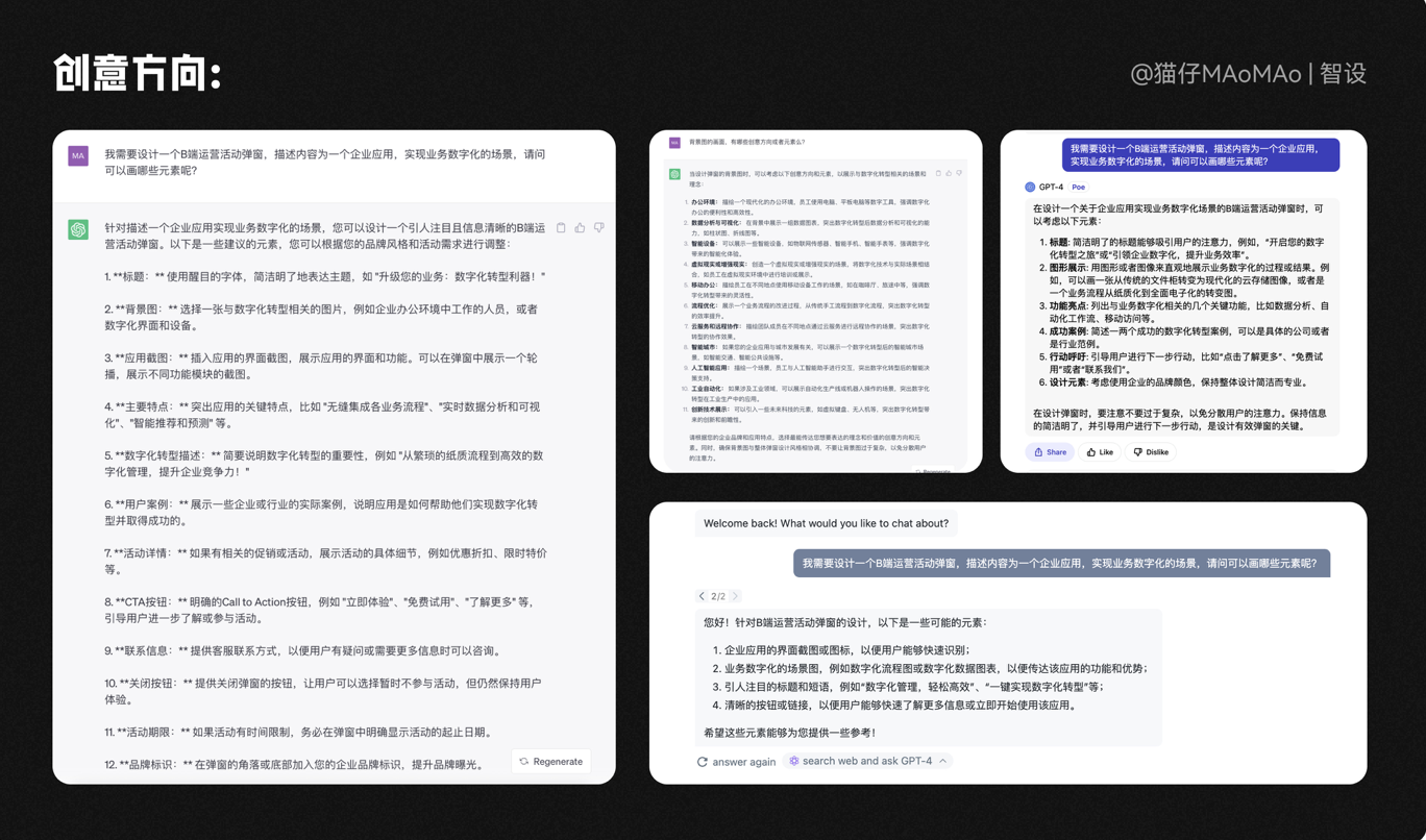 在沒有設(shè)計(jì)方向的時(shí)候,不妨讓AI大語(yǔ)言模型來幫助我們,它會(huì)根據(jù)需求的業(yè)務(wù)場(chǎng)景,給出合理的內(nèi)容建議,以及畫面元素的建議。