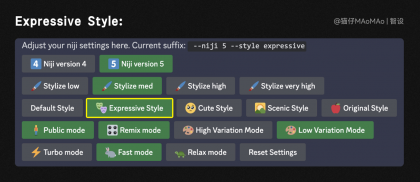 因?yàn)槭菃蝹€(gè)元素生成,背景環(huán)境關(guān)鍵詞可以省略,大家在編寫關(guān)鍵詞時(shí),注意靈活增減,不用一定按照所謂的公式來寫,藝術(shù)風(fēng)格是插畫素材,我們直接使用niji模型,其中expressive風(fēng)格會(huì)讓插畫更加富有表現(xiàn)力,可以直接在關(guān)鍵詞后面加上后綴“--style expressive ”,或者用“/settings”命令,更改設(shè)置。