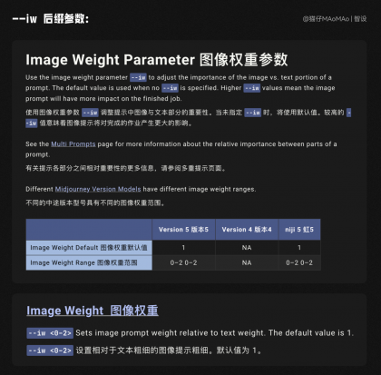 這個(gè)時(shí)候不要慌,也不要著急去改關(guān)鍵詞,我們只需要添加上一個(gè)神奇的后綴“--iw 2”,官方文檔的翻譯中,這個(gè)參數(shù)叫做“圖像權(quán)重參數(shù)”,用來調(diào)整關(guān)鍵詞中文本與參考圖的相似度,默認(rèn)值為 1 ,范圍為 0~2 ,值越高,生成的圖與原圖更像,注意在 V5 和 niji 模型中使用才能生效。