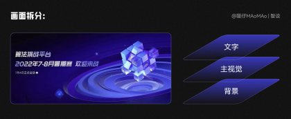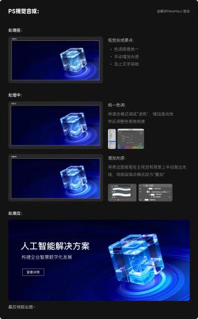 這一步考驗(yàn)的是設(shè)計(jì)師的審美和手活,我們需要把背景和主視覺素材,進(jìn)行視覺合成,其實(shí)也非常簡(jiǎn)單:這里我定的主要色調(diào)是藍(lán)色+青色的光感,首先需要將色調(diào)整體統(tǒng)一;然后想要表現(xiàn)出玻璃質(zhì)感的通透,我們需要加上一些光感;最后文字排版出圖即可~