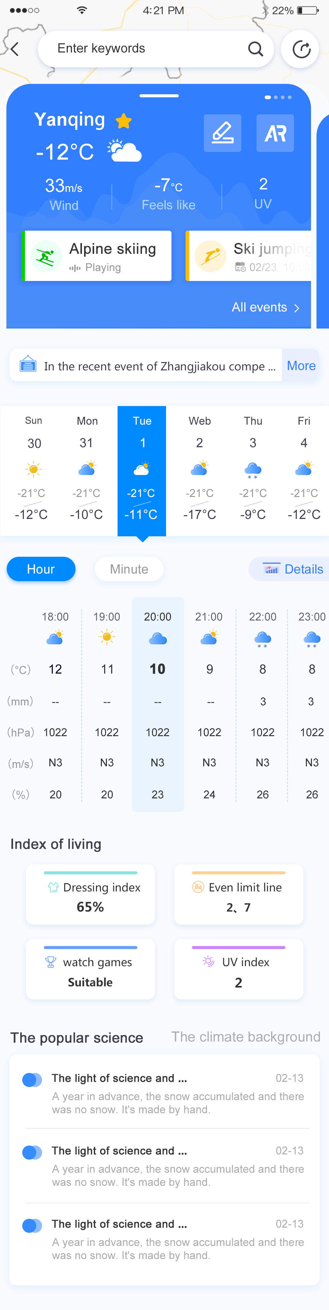 實(shí)況模塊,當(dāng)用戶在京津冀地區(qū)時(shí),進(jìn)入主頁便會(huì)顯示當(dāng)前位置的的實(shí)況信息,當(dāng)用戶不在時(shí)便會(huì)顯示為“北京賽區(qū)”的實(shí)況信息。點(diǎn)擊地點(diǎn)名稱旁邊的小箭頭,可以切換到其它賽區(qū)或者站點(diǎn)的實(shí)況天氣。實(shí)時(shí)信息往上滑動(dòng)便可以查看更多的氣象要素信息,如下圖。
