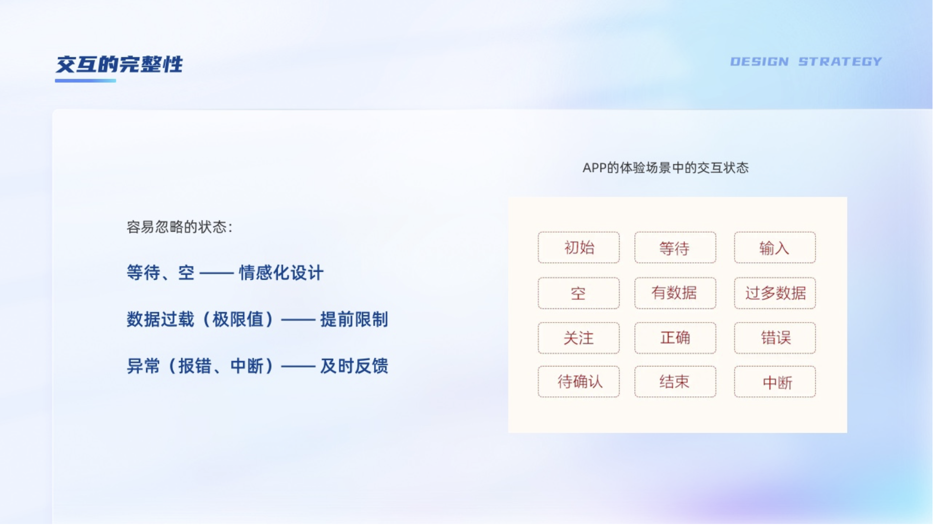 交互狀態(tài)都要考慮全面,如登錄前后狀態(tài),空狀態(tài),各個等級的狀態(tài),任務(wù)前后的狀態(tài),不同類別用戶的狀態(tài)等。