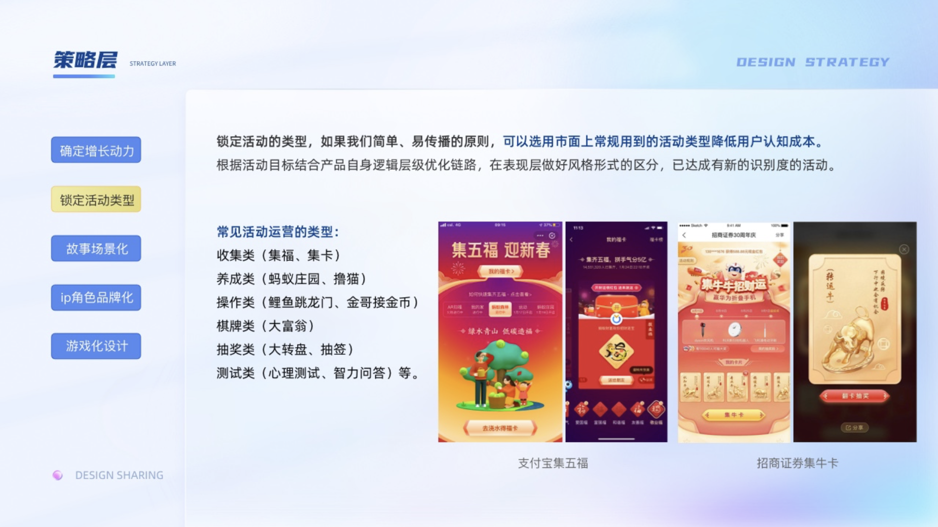 確定增長動力后,需要鎖定活動的類型。如果我們簡單、易傳播的原則,可以選用市面上常規(guī)用到的活動類型降低用戶認(rèn)知成本,對于一些比較有名的活動,像支付寶集五福,其本質(zhì)就是通過完成運營任務(wù)來收集某種虛擬物品,再由集齊的虛擬物品變現(xiàn)紅包完成用戶利益激勵。設(shè)計時不能完全照搬,既要根據(jù)活動目標(biāo)結(jié)合產(chǎn)品自身邏輯層級優(yōu)化鏈路,也要在表現(xiàn)層做好風(fēng)格形式的區(qū)分,已達(dá)成有新的識別度的活動。