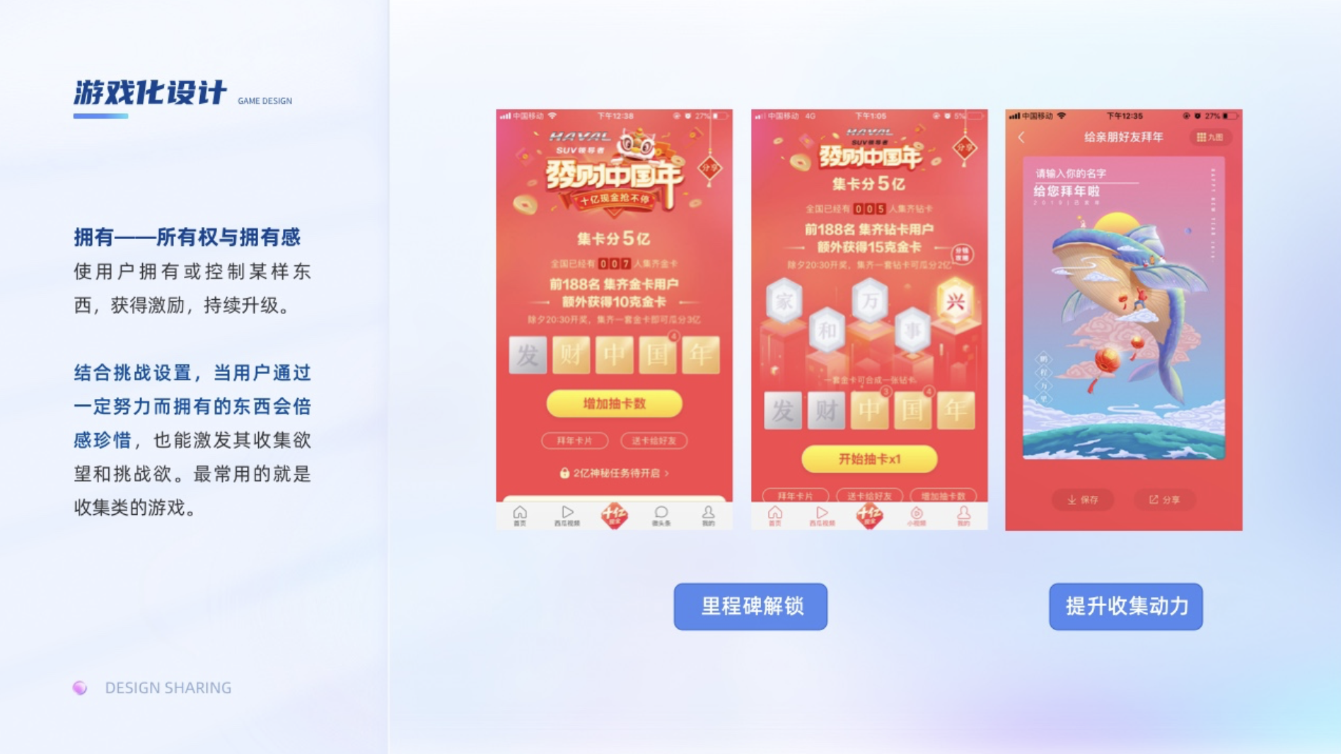 使用戶擁有或控制某樣?xùn)|西,獲得激勵,持續(xù)升級。結(jié)合挑戰(zhàn)設(shè)置,當(dāng)用戶通過一定努力而擁有的東西會倍感珍惜,也能激發(fā)其收集欲望和挑戰(zhàn)欲。最常用的就是收集類的游戲,比如各種收集類的活動中,先會獲得一個物品激發(fā)你對該系列的占有欲,不斷收集其他款。還有一種常用的是勛章的激勵,勛章本身是對行為的階段性的獎勵,好的策略和勛章樣式同樣能激發(fā)用戶的收集欲。