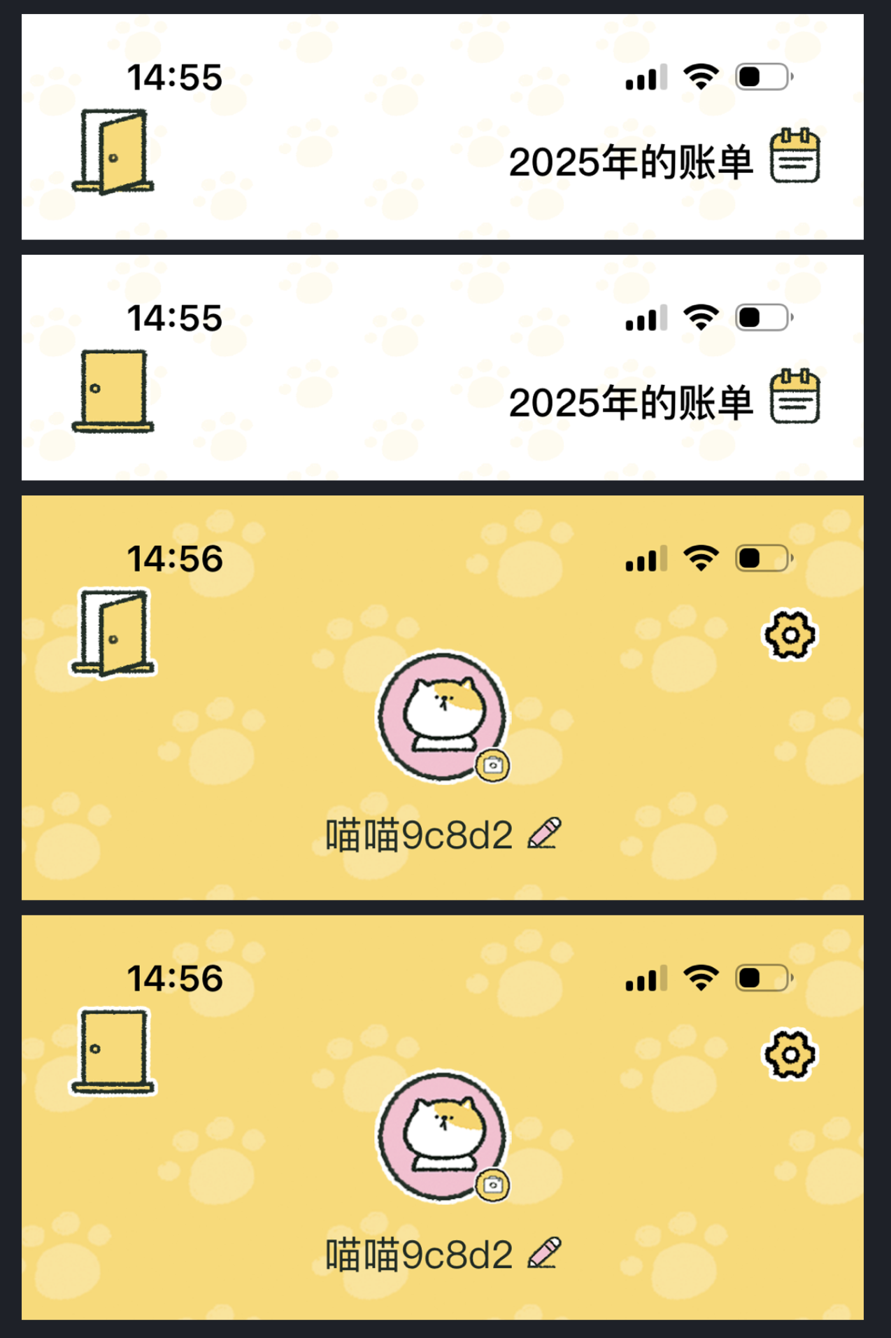 喵喵記賬 APP的做法,是把 “層級切換” 轉(zhuǎn)化為用戶熟悉的生活場景 —— 用 “門” 作為核心元素。