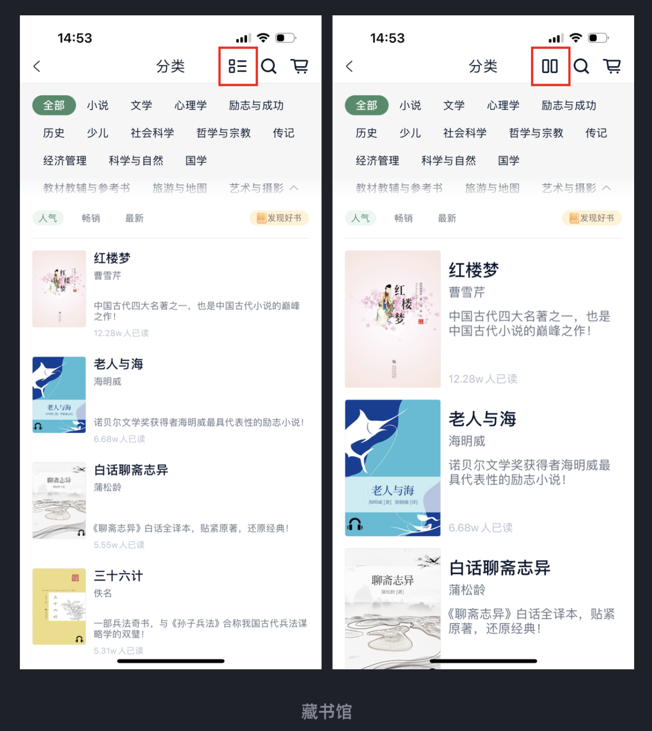 藏書館 APP在 “書庫分類” 模塊里,就做了 “可切換大小” 的布局設(shè)計(jì):