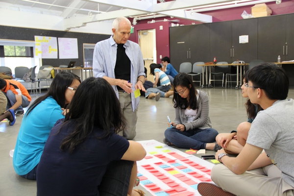 (圖為學(xué)員們?cè)贒.School用便利貼和海報(bào)紙來(lái)記錄想到的點(diǎn)子,白發(fā)老爺爺是D.School的講師,以前是Yahoo的PM,專門帶Ideate這一部分,講師們都有自己最擅長(zhǎng)和最喜歡帶的一個(gè)模塊)