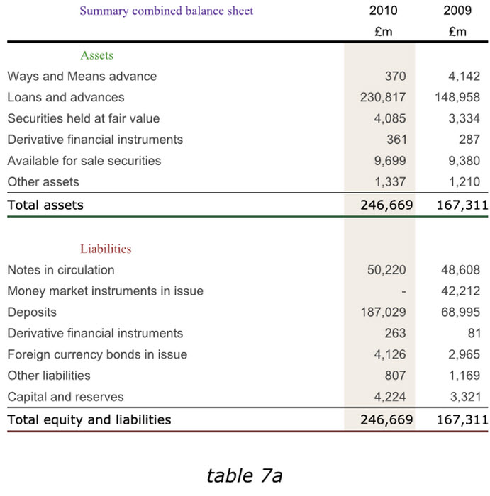 在表格中尋找信息時(shí),讀者希望前后采用同樣風(fēng)格,你應(yīng)該保證對同類元素使用同樣的字體,對同類數(shù)據(jù)使用同種對齊方式,還有諸如“列標(biāo)題”等各種突出顯示元素的一致性。看一下下面的表格7a,他展示了和前面表格1b同樣的英格蘭銀行2010年度數(shù)據(jù)信息。但是使用了有區(qū)分的表頭字體,標(biāo)簽以及加總格式,表頭采用了居中格式而不是和數(shù)據(jù)一樣右對齊,加總數(shù)據(jù)也沒有與數(shù)據(jù)嚴(yán)格對齊,同時(shí)為了區(qū)別資產(chǎn)和負(fù)債表格,他分別采用了不同顏色的字體,和表格中間粗細(xì)不同的線條。而所有這些實(shí)際上都讓我們產(chǎn)生一種不連貫的感覺,從而給瀏覽表格,把握重點(diǎn)帶來難度。