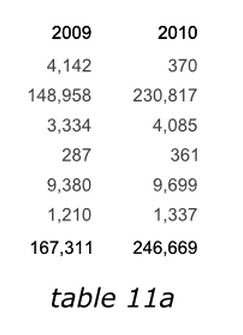 在表格10a和10b中我們已經(jīng)了解到,當(dāng)數(shù)據(jù)處于一列的時(shí)候,人們很容的可以比較數(shù)據(jù)并發(fā)現(xiàn)趨勢。瀏覽者可以快速的從上之下掃描縱向數(shù)據(jù),而對于長距離的橫向數(shù)據(jù),瀏覽就會遇到困難。然而我們再來看一下表格11a,去掉了所有的裝飾框,當(dāng)我們比較2009年和2010年數(shù)據(jù)的時(shí)候,數(shù)據(jù)橫向擺放要比11b中的上下擺放容易的多。