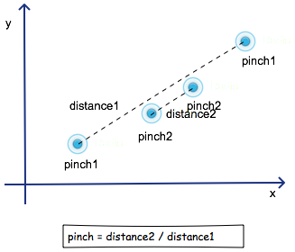 _onTouchMove(e) { if(e.touches.length > 1) { let xLen = Math.abs(e.touches[0].pageX - e.touches[1].pageX); let yLen = Math.abs(e.touches[1].pageY - e.touches[1].pageY); let touchDistance = this._getDistance(xLen,yLen); if(this.touchDistance) { let pinchScale = touchDistance / this.touchDistance; this._emitEvent('onPinch',{scale:pinchScale - this.previousPinchScale}); this.previousPinchScale = pinchScale;