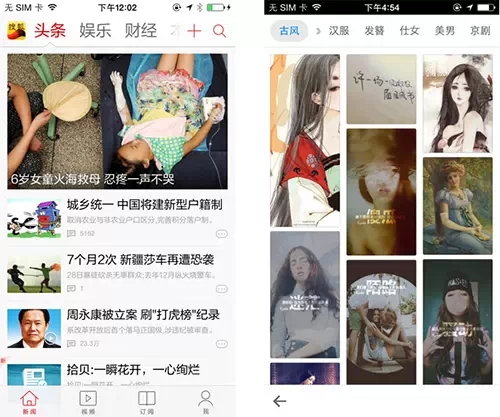 下面的左圖是一個新聞app,采用豎向分欄的布局,模塊化的結(jié)構(gòu)使得信息的展現(xiàn)整潔和嚴謹。右圖是一個圖片展示app,則采用了三欄的布局,把圖片以這種瀑布流的形式展現(xiàn)給用戶,方便用戶快速瀏覽。但是由于平級的信息,很難區(qū)分主次,而人的視線很難在同一時間聚焦在兩個或者兩個以上的事物上,所以通過圖片錯路排列,使得畫面更為活潑。