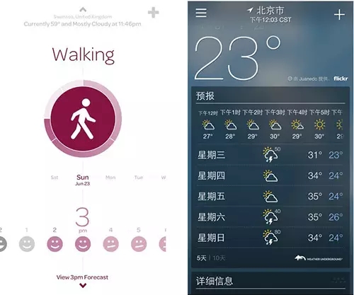 下面的兩個圖例雖然都以信息的展示為主,但因界面的信息量、app的功能特性因素的影響,左圖的運動記錄界面信息量比較上,采用了中軸型布局,而右圖的天氣app信息量比較大,采用了滿版型布局。合理的布局選擇對于信息的展示有至關(guān)重要的作用。