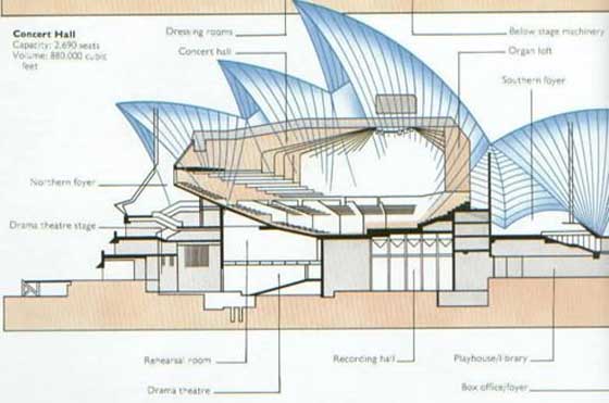 , 在最后找到一個經(jīng)濟上可以接受的解決辦法之前,設(shè)計隊伍反復嘗試了12種不同的建造“殼”的方法(包括拋物線結(jié)構(gòu),圓形肋骨和橢圓體)。后來團隊中的某個 人建議將所有球形房頂,在同一個巨大的同心圓上切割出來。該辦法可以使用一個共同的模具澆注出不同長度的圓拱,然后將若干有著相似長度的圓拱段放在一起形 成一個球形的剖面。究竟誰是這個解決辦法的發(fā)明者至今都是爭論的話題。 深化設(shè)計后的歌劇院變成了一個暖壺,內(nèi)外被分成了壺膽和壺罩的關(guān)系,這是建筑史上思想的一次突破,從此有一種建筑它的立面和內(nèi)部空間可以毫無關(guān)系了,所謂表現(xiàn)主義建筑就在這個蛋殼下誕生了。 當然制作這個“殼”是要付出代價的,悉尼歌劇院的“殼”由著名的建筑商Hornibrook Group Pty Ltd負責建造,Hornibrook在工廠中制成了2400件預制肋骨和4000件屋頂面板,加快了工程的進度。這個解決辦法的成就在于利用預制混凝土 構(gòu)建從而避免了建造昂貴的模具(他同樣允許讓屋頂面板在地上就大片的預先建造組合好,而不是在高處一個一個的拼接上)。Ove Arup和合作方的工地工程師驚訝于這些“殼”在完工前使用了創(chuàng)新的調(diào)節(jié)型彎曲鋼鐵桁構(gòu)梁來支撐不同的屋頂。 第三個大麻煩幾乎使工程被擱置了,悉尼歌劇院的屋頂是由2194塊每塊重15.3噸的彎曲形混凝土預制件,怎樣的力學結(jié)構(gòu)才能讓這些水泥砣安全地架在上 面,這是所有結(jié)構(gòu)工程師不曾遇到的挑戰(zhàn),大家都沒了信心,這是掉腦袋的活呀。主意還是來自門外漢,烏特松看見孩子玩的提線木偶,放在桌子上的時候是一灘爛 泥,把線體起來就精神抖擻了。最后工程師們用鋼纜把所有的預制構(gòu)建拉緊拼成的一體,屋頂?shù)闹亓Ρ幻恳粋€角度的部件分散了,這是建筑業(yè)上的一個偉大創(chuàng)舉。 第四個大麻煩幾乎是無法逾越的,也是工程師們永遠解決不了的,那就是預算不準確帶來的巨額超支。這個建筑本來的預算是700萬元,但最終的造價高達1億2 千萬元以上,為此州政府幾乎一度破產(chǎn),歌劇院成為全體澳大利亞人的一塊心病。為了籌措建造悉尼歌劇院的資金,卡希爾開始發(fā)行悉尼歌劇院的彩票。漸漸地設(shè)計 師烏特松成了悉尼的千古罪人,所有人都開始詛咒這個半路出家的二把刀。他與州政府的關(guān)系也慢慢開始惡化,最終雙方選擇決裂,1966年烏特松辭職而去,并 且發(fā)下誓言從此在不登上澳大利亞的國土。 我們的總設(shè)計師甩手走人后,原設(shè)計師團隊中的澳大利亞設(shè)計師們肩負起了歌劇院繼續(xù)修建工作,愛國主義和責任心支持者這些人在痛苦中掙扎,麻煩一個接著一個 出現(xiàn),但是解決麻煩的創(chuàng)意又一個一個誕生了,工程時干時停。整個州政府算是被綁架了,總不能扔個爛尾樓在悉尼市最美麗的港灣上吧?繼任的設(shè)計師們總體上堅 持了烏特松的設(shè)計理念,只有在最后的裝修階段,選擇了更為粗狂的風格,看上去像是一個大毛坯房,而不是烏特松這位瑞典家居設(shè)計師腦海里原本想像的奢華浪 漫,一方面是因為七十年代的時候水泥建筑非常流行,另一方面可能也是很大的原意就是建造悉尼大劇院的整個過程中一直都是缺錢的狀態(tài)。 除了建筑結(jié)構(gòu)部分的精彩,這部建筑作品還在有著建筑業(yè)內(nèi)另外的成就,首先是屋頂?shù)拇纱u,在建筑的設(shè)計初期,很多人就提出了該建筑清洗方面的質(zhì)疑,烏特松開 始設(shè)想一種不用清洗的方式解決它,一家丹麥的瓷磚公司為此投入了研究。最后悉尼歌劇院的屋頂覆蓋著105萬塊白色或奶油色的瓷磚,瓷磚是亞光與拋光的相間 排列,在太陽光的照射下閃閃發(fā)光。瓷磚經(jīng)過了特殊處理,因此不怕海風的侵襲,也不需要清洗。對于一個1958年的建筑來說, 另外一點,整個悉尼歌劇院采用的是集成式設(shè)計體系,所有的地板都是水泥預制件,用四條螺絲固定在地面上,隨時可以拆卸掉起,這為維修地面下面的管線提供了 最好的解決方案,這在上個世紀五十年代也是第一次有人嘗試的建筑方法。還有一點更加令人驚嘆,這個劇院沒有空調(diào)系統(tǒng),它的恒溫系統(tǒng)來自周圍的海水。一系列 工程學、材料學、建筑學、設(shè)計學上面的突出表現(xiàn),讓悉尼歌劇院成為了人類建筑史上的璀璨明珠。 經(jīng)過了千辛萬苦的努力與堅持,悉尼歌劇院最后在公元1973年10月20日正式開幕。開幕式邀請了英國女王親臨現(xiàn)場。悉尼歌劇院在英國女皇伊麗莎白二世