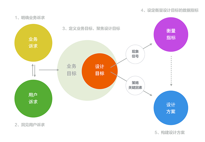 明晰了底層世界觀后,我們團隊逐層向上累積出了我們的方法論,包括thinkflow,workflow,等等,其中最具有代表性的就是剛才提到的《五導家》。五導家是一種設計崗位的思考過程方法論,它包含一個以目標用戶為源頭的5步驟思考路徑,及相關(guān)方法和原則,通過深度解構(gòu)+全鏈路串聯(lián)的方式,總結(jié)和表達作為職能部門的UED團隊在設計工作中思考路徑的普遍規(guī)律,力爭將原來那些模糊、零散的概念信息(如業(yè)務訴求、用戶訴求、業(yè)務目標等)及思考環(huán)節(jié)(如何從訴求到目標,如何從目標到指標,如何從目標到方案等)進行串聯(lián)和體系化。