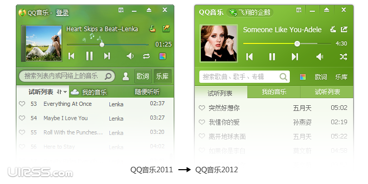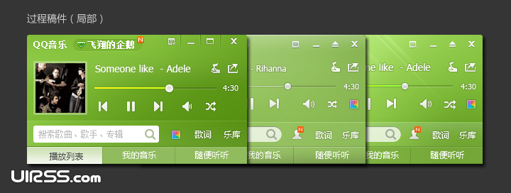 早在2011年7月,QQ音樂2011beta版的發(fā)布便確立了用品牌色–綠色,做為QQ音樂客戶端的默認顏色,綠色代表和平、希望、生長和環(huán)保,對QQ音樂的品牌形象有積極的正面意義,此外,縱觀競品,常見的客戶端配色多為黑和藍,用綠色也較利于提高產品的識別度。QQ音樂2012賀歲版的視覺,也是圍繞綠色和細節(jié)進行全面的體驗優(yōu)化。項目從去年12月31號開始,進行了為期15天的設計和快速迭代。