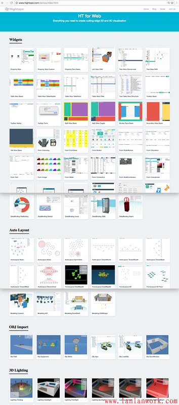 這樣綜合并可搜索的手冊(cè)入口居然還常被問及 HT 的 Demo 在哪里?只能怪這些年深入人心的用戶體驗(yàn)理念,把人慣得包括很多程序員都如此之“懶”,當(dāng)然也怪我們沒把用戶體驗(yàn)的最后一公里做到位,于是最近 wangyinlong 同學(xué)人工例子抓圖,將數(shù)百個(gè)手冊(cè)例子進(jìn)行了歸類整理,最終形成了方便大家直觀查找所有 HT 例子的頁面:http://www.hightopo.com/demos...
