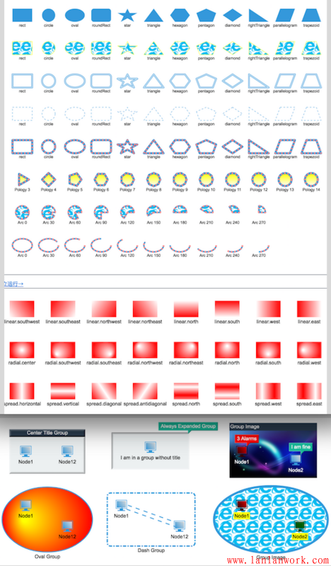 剛才的例子我們提到了一個(gè) Group 類型,這個(gè)類型圖元節(jié)點(diǎn)在 GraphView 上顯示成了組合效果,可雙擊展開合并,可跟隨著孩子節(jié)點(diǎn)的位置大小變化和自適應(yīng)變動(dòng),除了 Node、Edge、Group 外,HT 還提供了 Shape、Polyline、Grid、SubGraph 等多種圖元類型,這些圖元類型都具是有針對(duì)性的展示效果,以滿足各種行業(yè)的基本圖元需求:http://www.hightopo.com/guide...