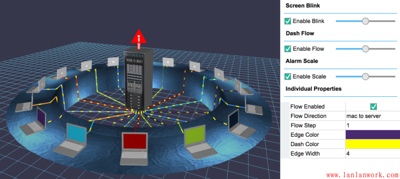 構(gòu)建出拓?fù)鋱D后很多人關(guān)系的是如何實(shí)現(xiàn)動(dòng)畫,動(dòng)畫從本質(zhì)上來說就是在一定的時(shí)間點(diǎn)上驅(qū)動(dòng)圖元的參數(shù)變化,例如大小、顏色、粗細(xì)包括可見不可見等來實(shí)現(xiàn)各種動(dòng)畫效果,而 HT 本來所有圖元都是數(shù)據(jù)驅(qū)動(dòng),用戶隨時(shí)可以修改 Data 上的任何屬性,因此隨便起個(gè)定時(shí)器 windwo.setInterval 不斷改變圖元屬性值即可實(shí)現(xiàn)動(dòng)畫效果,但為了方便客戶 HT 還提供了諸多方便函數(shù)和插件。