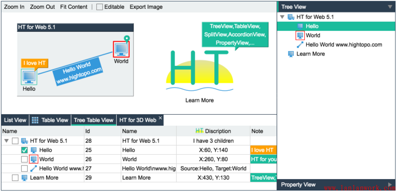 這個(gè)例子增加了設(shè)置父子關(guān)系的代碼,同時(shí)有更多的組件(拓?fù)鋱D、屬性頁、列表、樹、表格、樹表組件)綁定了同一個(gè)數(shù)據(jù)模型 DataModel,但用戶的代碼依然主要在 Data 和 DataModel 上的操作,這也是 HT 架構(gòu)設(shè)計(jì)的優(yōu)勢(shì),用戶使用更多組件并沒有增加新的學(xué)習(xí)成本,只要掌握的 DataModel 的基本操作,更多的組件也是如此。