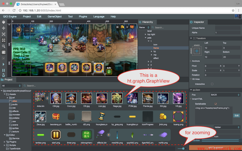 整個(gè) QICI Engine 的 HTML5 游戲引擎編輯工具就是基于 HT 組件定制開發(fā)出來的,上圖刀塔場景的資源管理器就是圖標(biāo)可縮放,圖集可展開合并,可縮小變成樹層次的 GraphView 拓?fù)鋱D,而第二張的動(dòng)作編輯器、曲線編輯器等等部分也都是 GraphView 的身影。