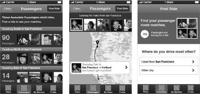 首先,我們分析了駕車者通常會(huì)出于怎樣的目的來發(fā)起拼車活動(dòng),并將這些原因列成一份清單。接下來,我(英文原文作者)對應(yīng)著這份清單繪制了一些簡單的草圖,將有可能符合駕車者需求的功能和內(nèi)容初步的勾勒出來。然后,大家對這些草圖進(jìn)行討論評估,將其中我們認(rèn)為最可行的5個(gè)概念進(jìn)一步落實(shí)到線框原型當(dāng)中,并向一些目標(biāo)用戶(獨(dú)自駕車者)進(jìn)行了展示,通過他們的反饋來驗(yàn)證我們的假設(shè)。