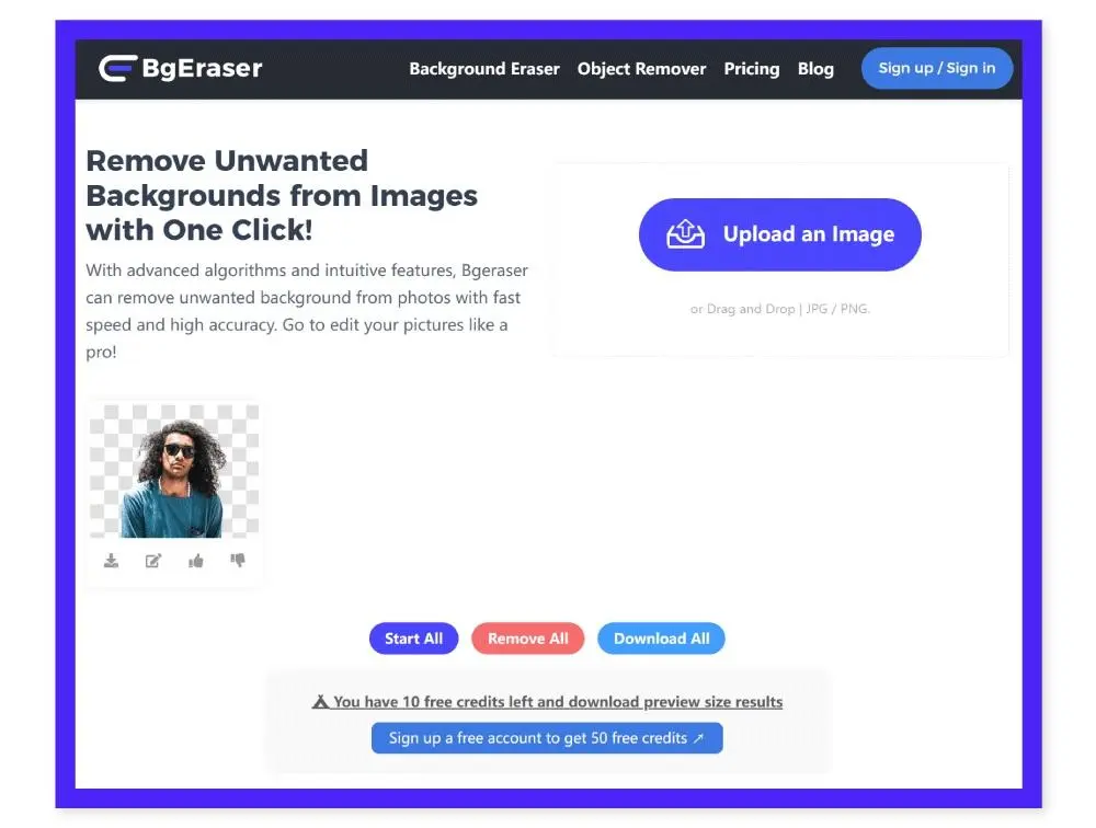 一個(gè)專(zhuān)注于 AI 摳圖網(wǎng)站,支持批量處理。上傳圖像后點(diǎn)擊 start 開(kāi)始處理圖像,摳圖時(shí)間在 30s 左右。新用戶(hù)有 10 次的免費(fèi)摳圖額度,注冊(cè)登錄后額度可以上升至 50 次。